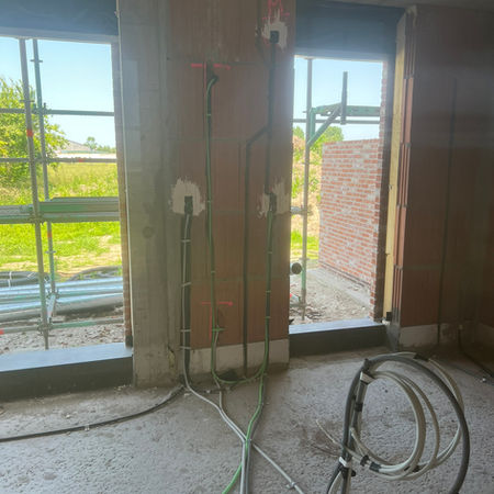 Tijdens de ruwbouwwerken werden alle leidingen en inbouwdozen keurig en nauwkeurig geplaatst, met oog voor detail en een vlotte verdere afwerking. De installatie werd nadien correct afgewerkt en voorbereid voor een probleemloze keuring en indienststelling.